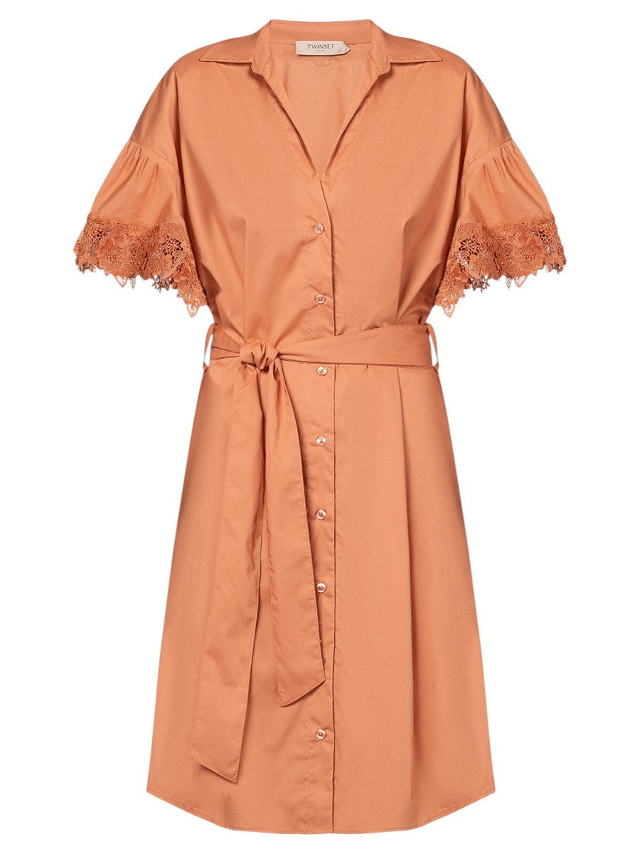Objevte nadčasovou eleganci našich košilových šatů, zdobených jemnou krajkou ve tvaru květiny. Tyto šaty jsou spojením klasického stylu a současných prvků, s odnímatelným páskem, který definuje siluetu, a tvarovaným lemem, který dodává nádech sofistikovanosti. Kovové logo a promyšlené drapérie zdůrazňují pozornost k detailu. Vyrobeno z bavlněné příměsi elastanu, nabízí pohodlí a přiléhavý střih, ideální pro každou příležitost.