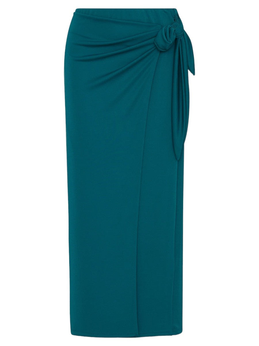 Discover the effortless elegance of our jersey wrap skirt. With a flowing line that wraps delicately around the figure, this skirt features sophisticated side draping and a knot closure at the hip that adds a touch of sophistication. The elastic waist at the back ensures comfort and a perfect fit. Ideal for a daytime look or for a special occasion.