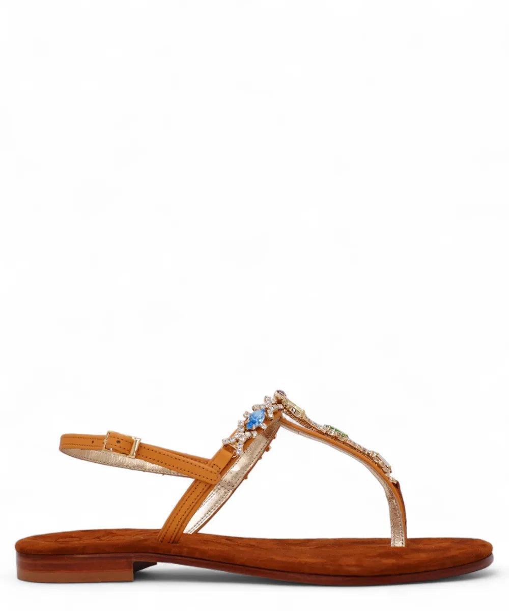 Show off the effortless elegance of the island of Capri with our “T” thin-strap thong sandal , embellished with understated and refined multi-coloured jewel appliques.