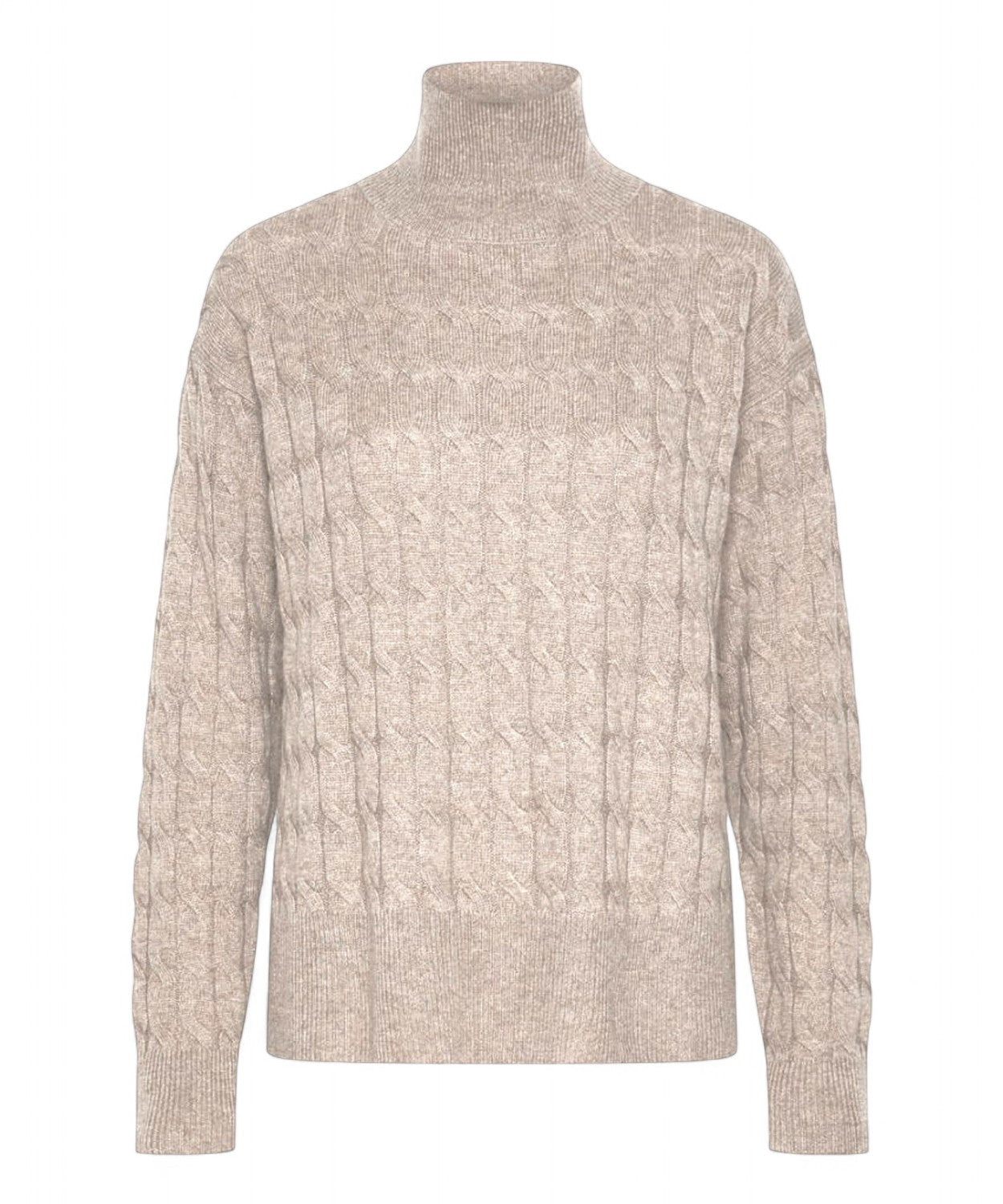 Il motivo a trecce dona al capo un fascino classico e raffinato, mentre il collo alto a coste valorizza la silhouette e offre comfort termico impeccabile. I polsini e il fondo a costine completano il design con un tocco di eleganza contemporanea.