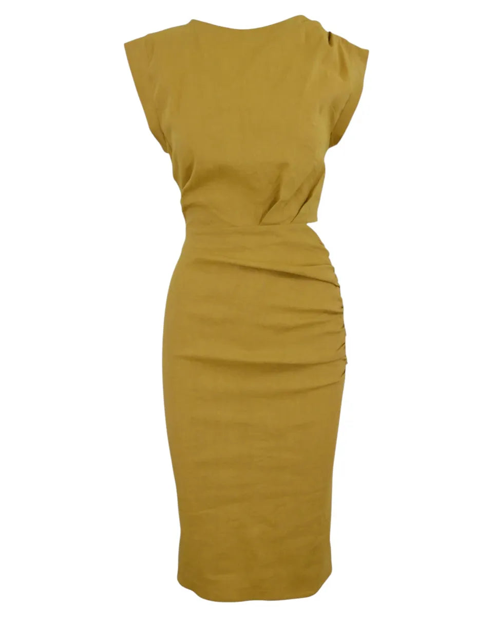 Elegant, fresh, and with a contemporary cut: this stretch linen midi dress is perfect for summer days and special occasions with a sophisticated dress code. The sleeveless design is enhanced by prominent armholes and a refined side opening , which discreetly adds sensuality and femininity.