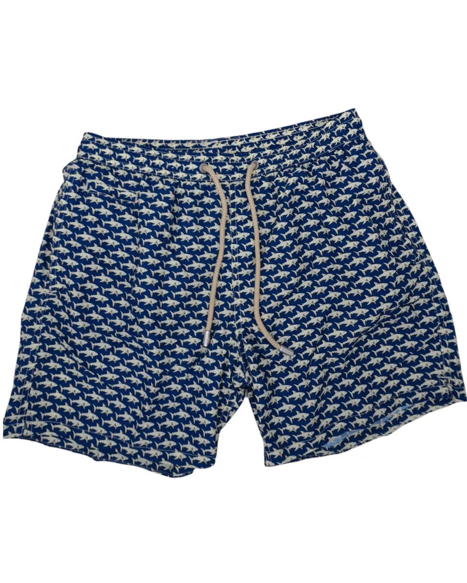 The Lighting swimsuit is made of lightweight, quick-drying fabric, hence its name. Crafted from 100% recycled polyester, it demonstrates our commitment to sustainability. It features a mid-length, a shark print on a navy blue background, an elasticated waist with an adjustable drawstring, and a mesh lining for maximum comfort. The side pockets with French seams and a buttoned back pocket offer practicality, while the branded eyelets facilitate water drainage and prevent swelling. Classic fit with an MC2 Saint Barth label on the back.