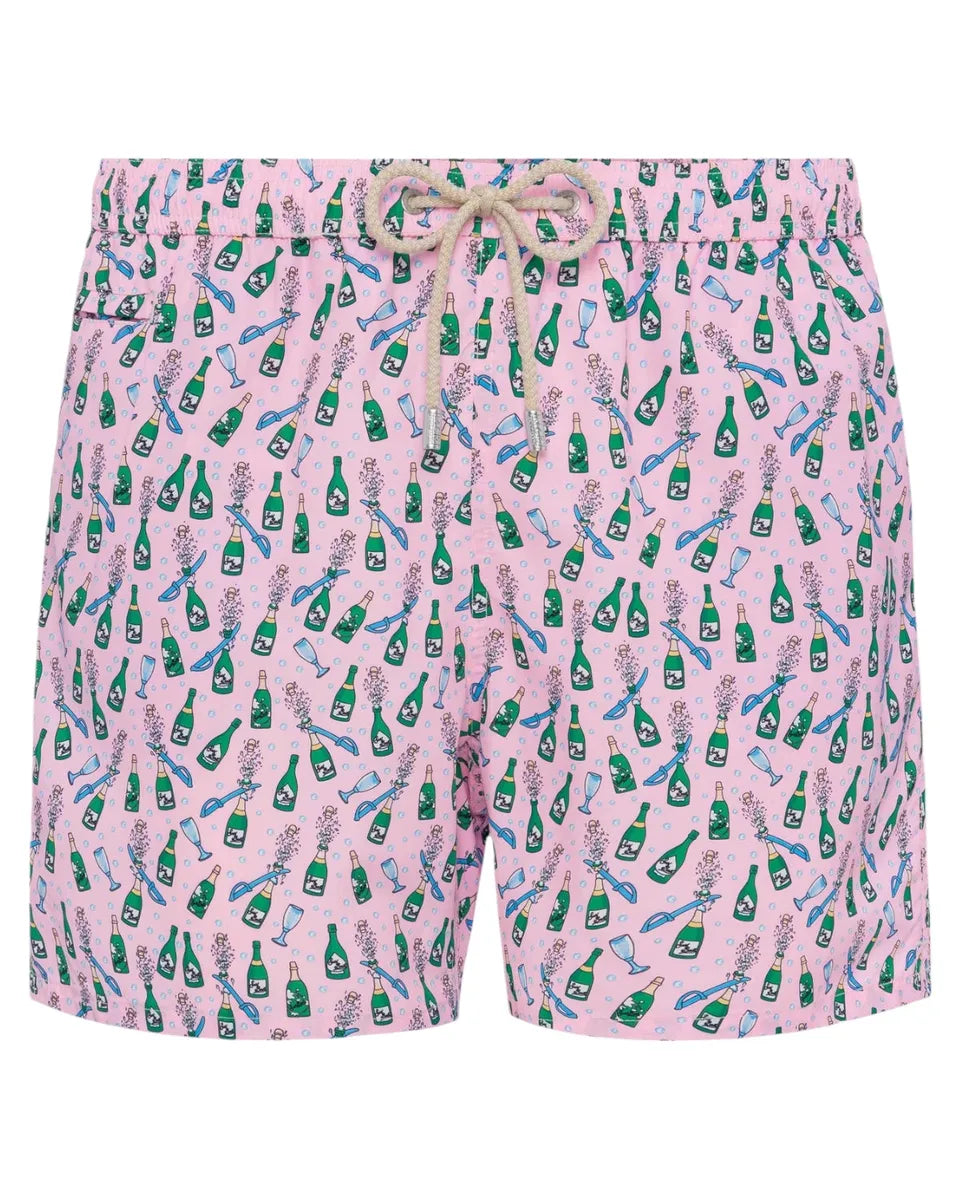 The vibrant all-over print of sabrage bottles on a pink background adds a distinctive and original touch to your summer look. The design is complemented by functional and thoughtful details:
