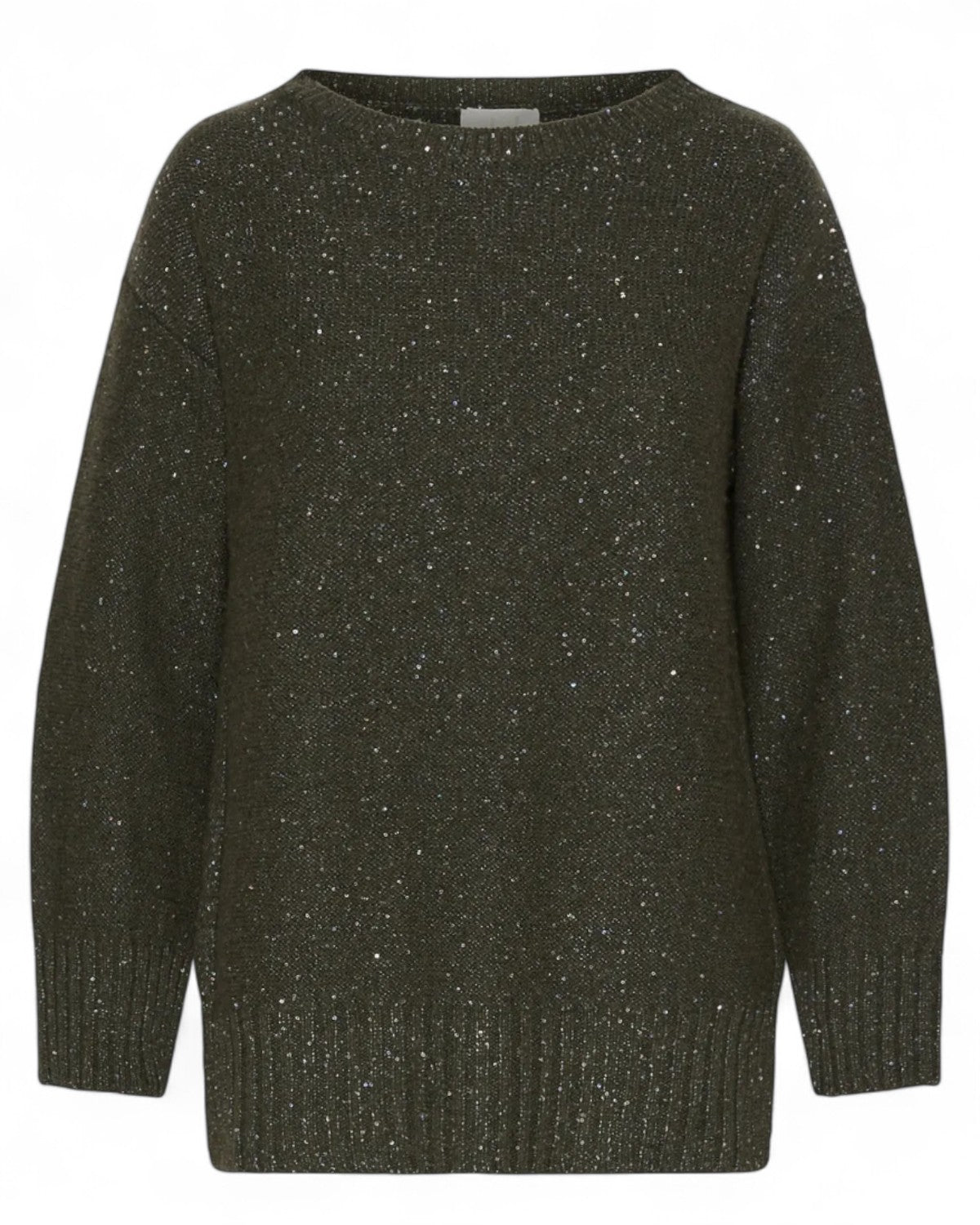 Questa maglia unisce il comfort del misto lana e cashmere alla luminosità discreta delle paillettes, per un capo sofisticato e versatile. Dal fit dritto e lineare, presenta uno scollo a giro con spalla scesa che dona morbidezza alla silhouette. Gli spacchi laterali alti, fermati da bottoncino interno, aggiungono un dettaglio originale e glamour, perfetto per look da giorno o da sera. I bordi a costine rifiniscono il design, valorizzando uno stile essenziale ma ricercato.