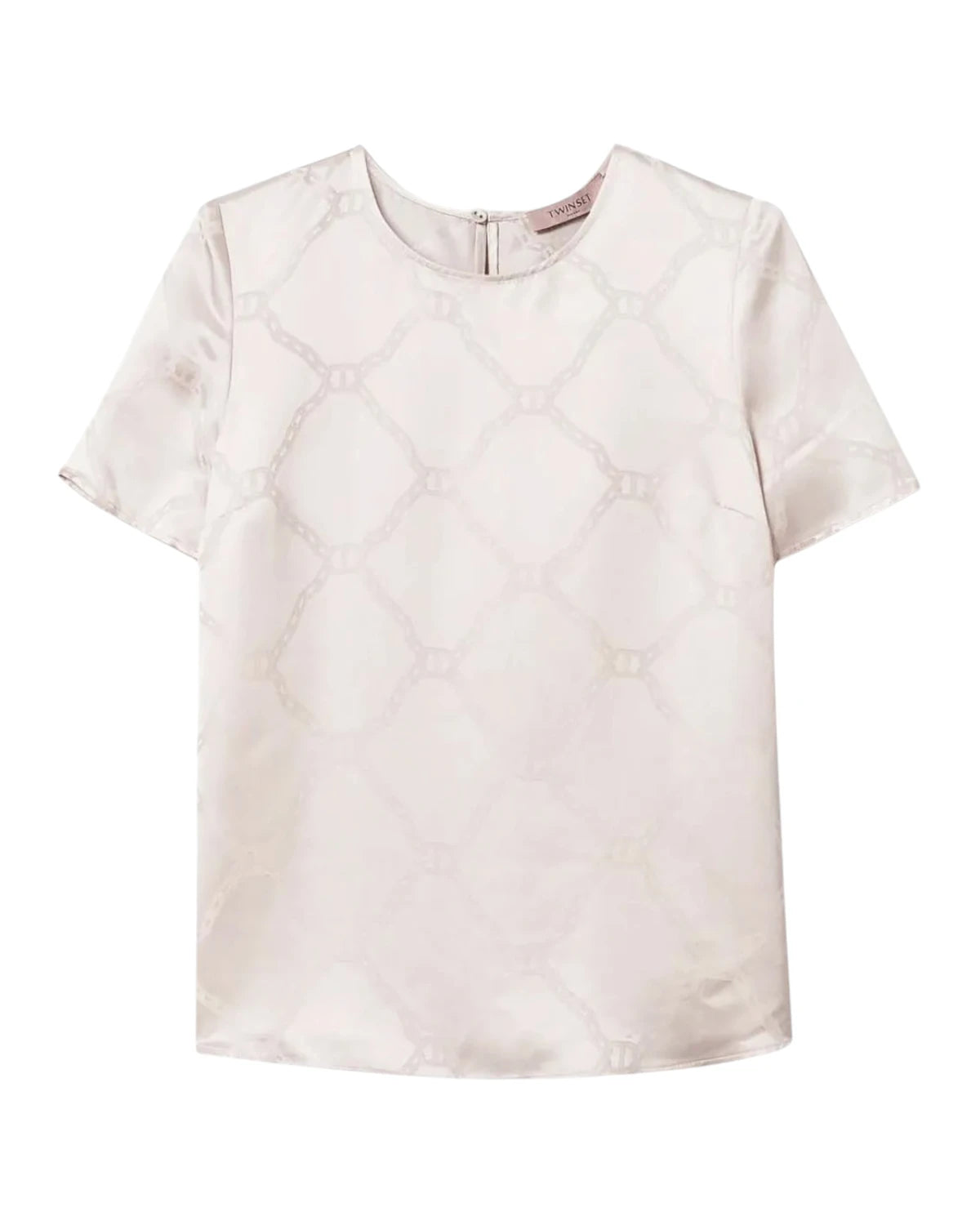 Understated elegance and exclusive graphics meet in this Italian-made jacquard satin blouse. The tone-on-tone Oval T chain motif plays with the alternating sheen and matte effect, creating a refined and distinctive Twinset effect. The fluid lyocell and viscose fabric glides effortlessly over the skin, lending a sophisticated allure.