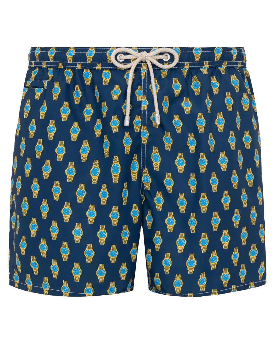 The Lighting swimsuit by MC2 Saint Barth combines performance, comfort, and style in a single piece. Made from 100% recycled polyester , it is designed with a lightweight, quick-drying fabric , ideal for your days at the beach or pool. The design stands out for its original all-over print with watches on a navy blue background, while the elasticated waist and adjustable drawstring with branded ends ensure a tailored fit.